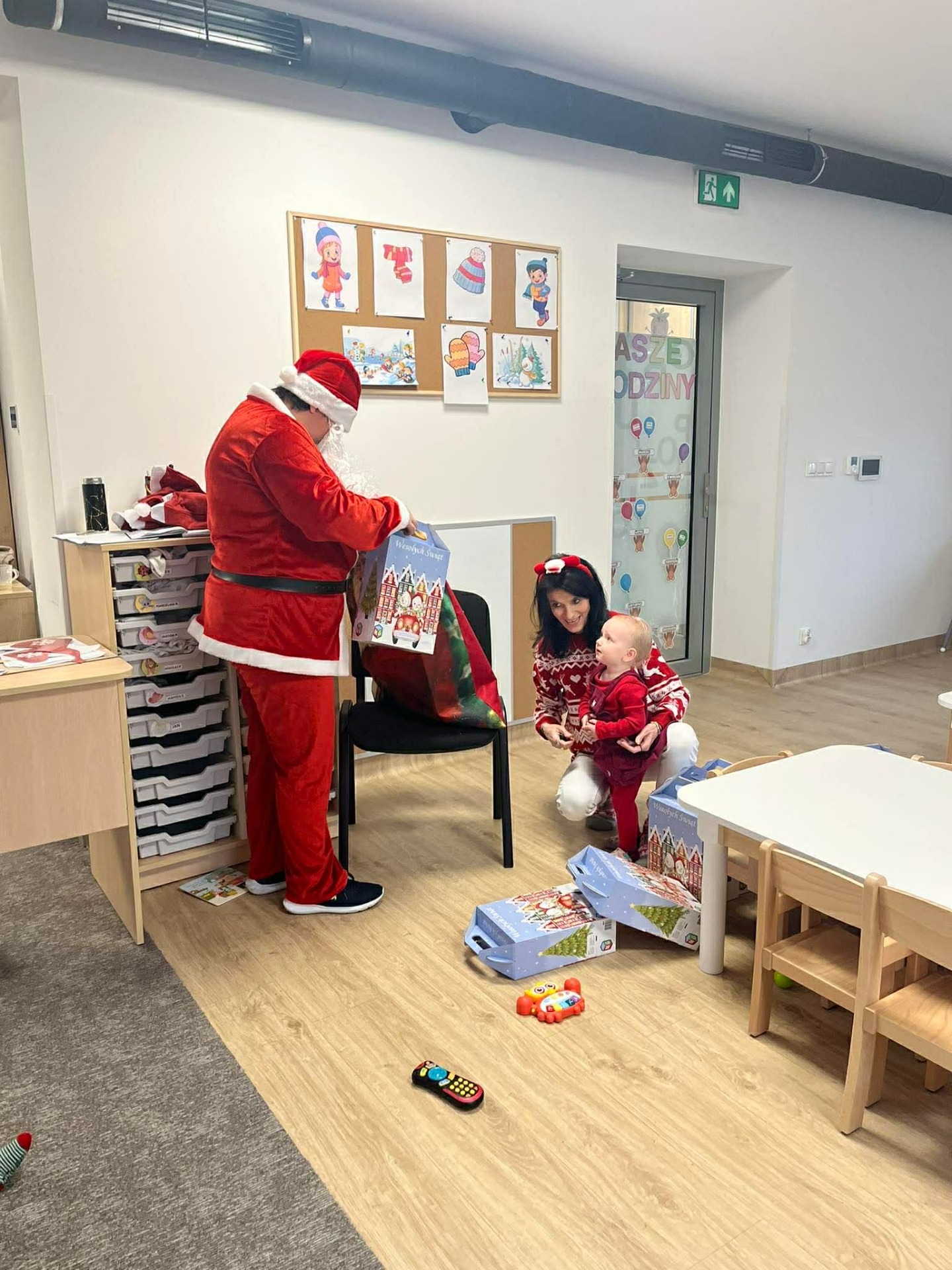 Dzieci z radością przywitały gościa, śpiewały piosenki i z wielkim zaciekawieniem czekały na prezenty. Mikołaj nie zawiódł — obdarował każde dziecko pięknym upominkiem, wywołując mnóstwo uśmiechów i zachwytu.